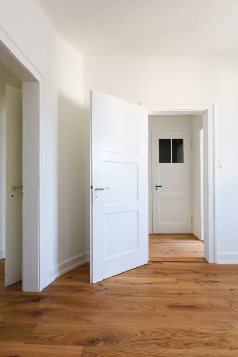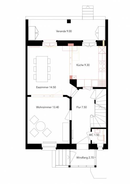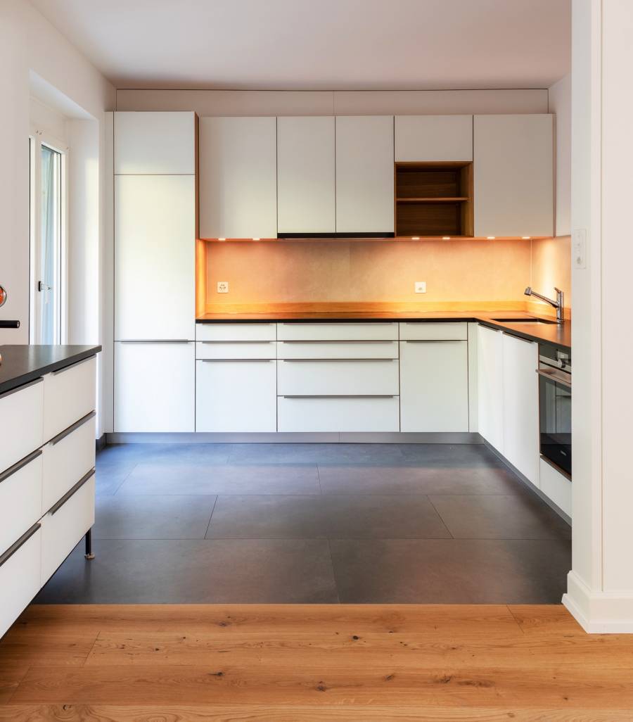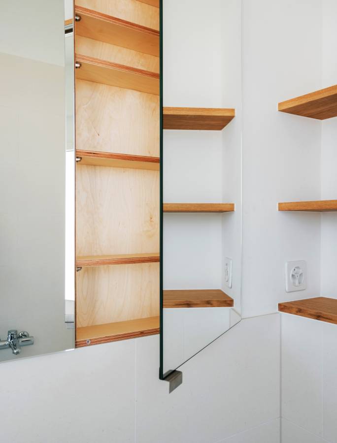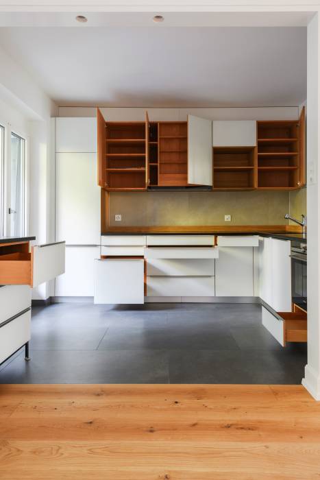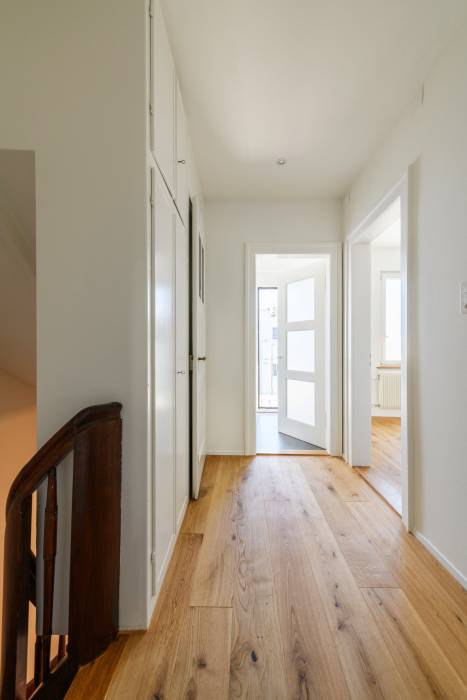 Das Haus aus dem Jahr 1930 wird einer Gesamtsanierung unterzogen und den Bedürfnissen der neuen Eigentümerschaft angepasst. Zwei grosszügige Durchbrüche verbinden einerseits das Wohn- mit dem Esszimmer und andererseits das Esszimmer mit der Küche. Eine neue Fenstertür bringt Licht bis in die Tiefen des Grundrisses. Das kleine Bad wird durch die Verschiebung einer Wand vergrössert. Darüber hinaus werden Spannteppiche und abgehängte Decken vergangener Umbauten entfernt, die Jahre gekommenen elektrischen Installationen, Wasser- und Abwasserleitungen ersetzt und eine neue Heizung eingebaut.