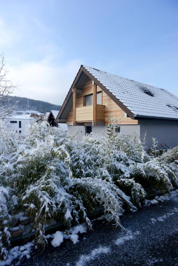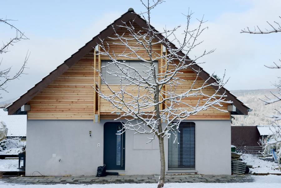 Das Penta-Haus ist das meistgebaute Einfamilienhaus in der Schweiz. Die Fassade des Fertighauses aus den 1970er Jahren entsprach nicht mehr den heutigen energetischen Anforderungen und der Wohnkomfort war erheblich eingeschränkt. Die marode Giebelfassade wurde erneuert und gedämmt. Mit der horizontalen, unbehandelten Lärchenschalung bekommt das Fertighaus ein neues und individualisiertes Äusseres.