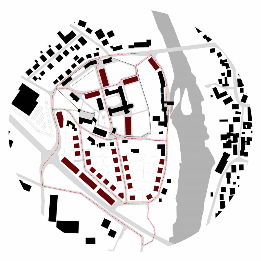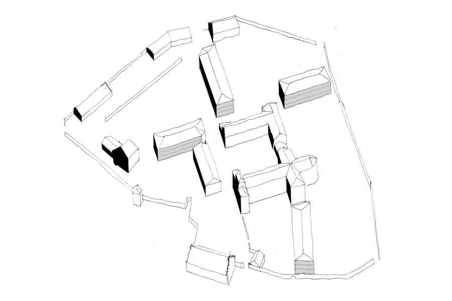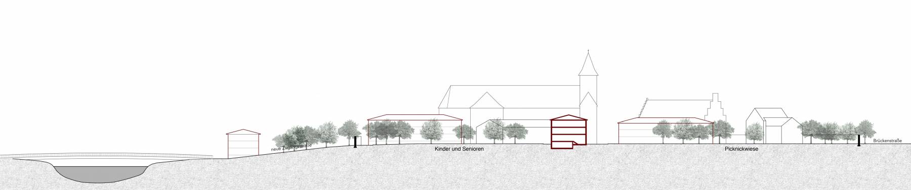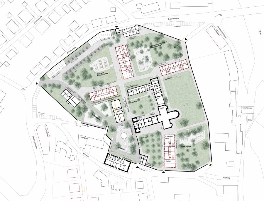 Durch die Ergänzung des heterogenen Baubestands durch vier Neubauten werden 8 unterschiedliche Orte geschaffen: ein Ort des Gedenkens, ein Ort für die Jugend, ein Sportplatz, ein Kinderspielplatz, eine Picknickwiese, ein inklusives Café, eine Blumenwiese und ein Klosterhof. Die 8 Orte spiegeln die facettenreiche Geschichte der Anlage wider und verfügen je über ihre eigenen Qualitäten.